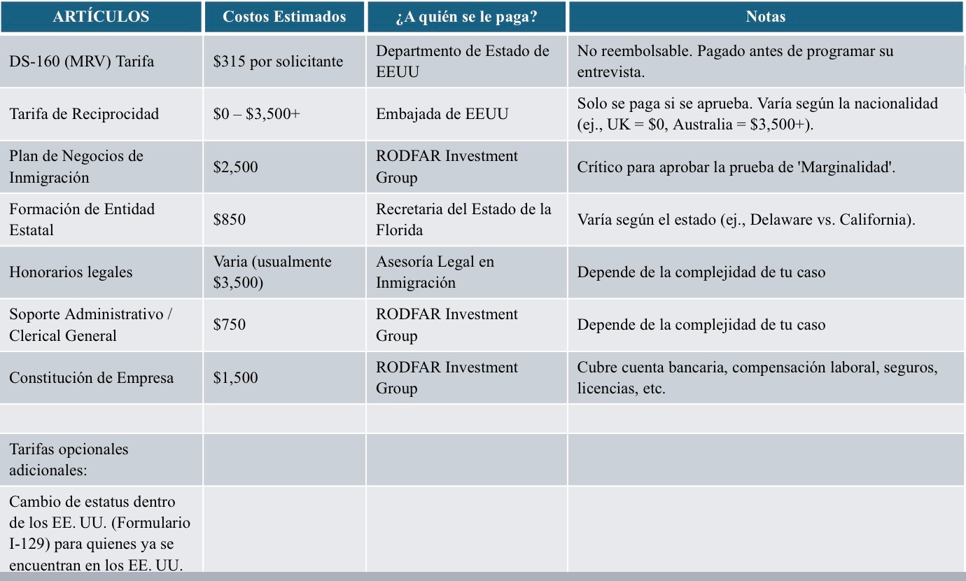 Para asociarse con nosotros en una inversión, requerimos un mínimo de $100,000 dólares estadounidenses. Su dinero estará respaldado por una inversión real. RODFAR Investment Group tiene actualmente más de 4.5 millones de dólares invertidos en el Estado de Florida (principalmente en propiedades inmobiliarias). Usted será propietario de al menos el 50% de la nueva compañía, hasta el monto proporcional real de su inversión.